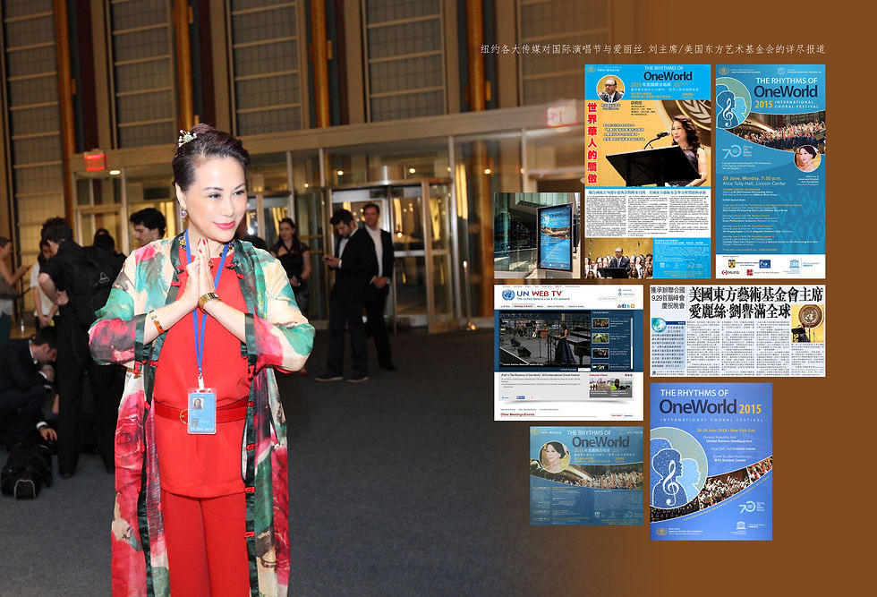 美国东方电视台/东方网报道:今年是聯合國成立70周年,也是反法西斯戰爭和抗日戰爭勝利70周年。在9月21日聯合國國際和平日前後,聯合國相關直屬機構將陸續在聯合國總部和世界各地舉辦各種形式的慶祝活動。頗有實力的美國東方藝術基金會,作為該基金會主席的愛麗絲-劉,在2015年的年初,首次將中國春晚帶進聯合國總部,主辦了首屆聯合國春晚,繼而又在今年的六月份,贊助聯合國總部舉辦的2015國際合唱節。在聯合國聯大會議廳、紐約大學、林肯中心等五個場地連續舉辦。為此,在70屆聯大 9月21日召開之後的一個星期,也就是9月29日,在習近平主席參加在聯合國首腦峰會期間,美國東方藝術基金會將贊助和承辦聯合國70周年慶典大型演出活動,慶祝晚會將在聯合國總部代表團宴會廳舉辦。基金會主席愛麗絲·劉親自擔任總策劃和總導演,以保證這次盛大的70屆首腦峰會慶祝晚會圓滿成功 !
