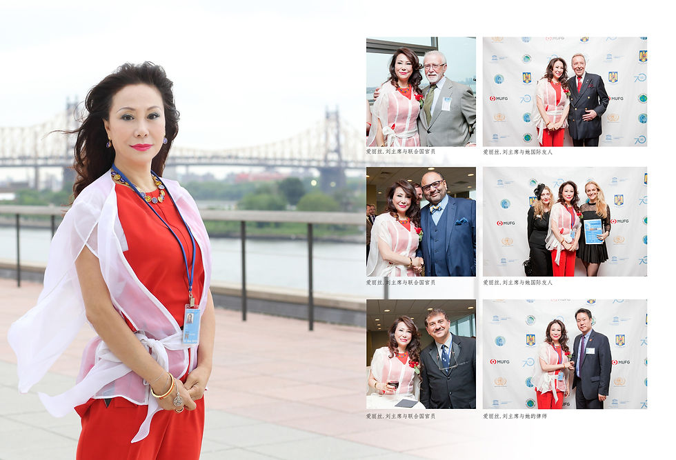 愛麗絲-劉主席立誌成為世界和平、和全人類發展謀福祉的愛心天使,在聯合國70周年之際,贊助了五天大型慶祝活動。此舉得到了聯合國總部、聯合國秘書處、聯合國教科文組織、世界各大團體和主流媒體的一致贊賞!